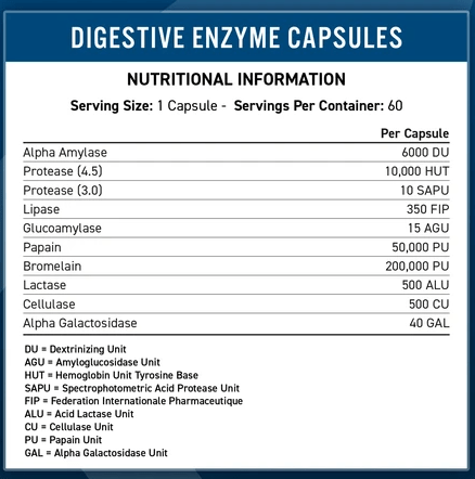 Applied Nutrition ZyMate Digestive Enzymes is a multi-enzyme blend of alpha amylase, glucoamylase, lactase, neutral protease, acidic protease, lipase, cellulase, bromelain, papain and alpha-galactosidase to aid the digestion of carbohydrates, lactose, proteins, fats and cellulose and to help control flatulence.