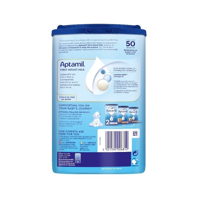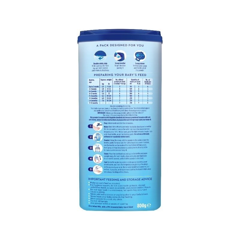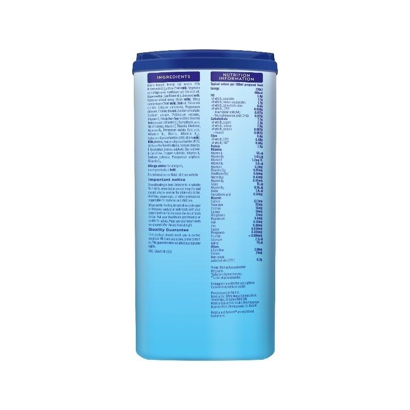 Dairy-based blend (of which 29% is fermented) [Lactose (from milk), Vegetable oils (High oleic sunflower oil, Coconut oil, Rapeseed oil, Sunflower oil), Skimmed milk, Demineralised whey (from milk), Whey concentrate (from milk), Fish oil, Potassium citrate, Calcium carbonate, Magnesium chloride, Choline chloride, Calcium phosphate, Sodium citrate, Potassium chloride, Vitamin C, Emulsifier (Soy lecithin), Inositol, Antioxidant (Vitamin C), Pantothenic acid, Nicotinamide, Vitamin E, Thiamin, Riboflavin, Vitamin B6, Potassium iodide, Folic acid, Vitamin K1, Biotin, Vitamin B12], Galacto-oligosaccharides (GOS) (from milk), Milk protein, Fructo-oligosaccharides (FOS), Oil from Mortierella Alpina, Sodium chloride, L-Tryptophan, Ferrous sulphate, Zinc sulphate, L-Carnitine, Copper sulphate, Vitamin A, Sodium selenite, Manganese sulphate, Vitamin D3.