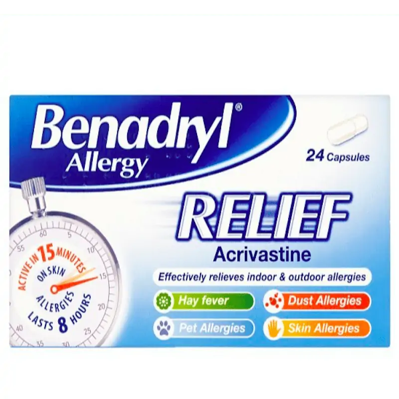 Benadryl Allergy Relief Capsules provide fast and effective relief from hay fever, pet, dust and skin allergies. Each capsule contains acrivastine, a non-drowsy antihistamine, suitable for adults and children over 12 years.