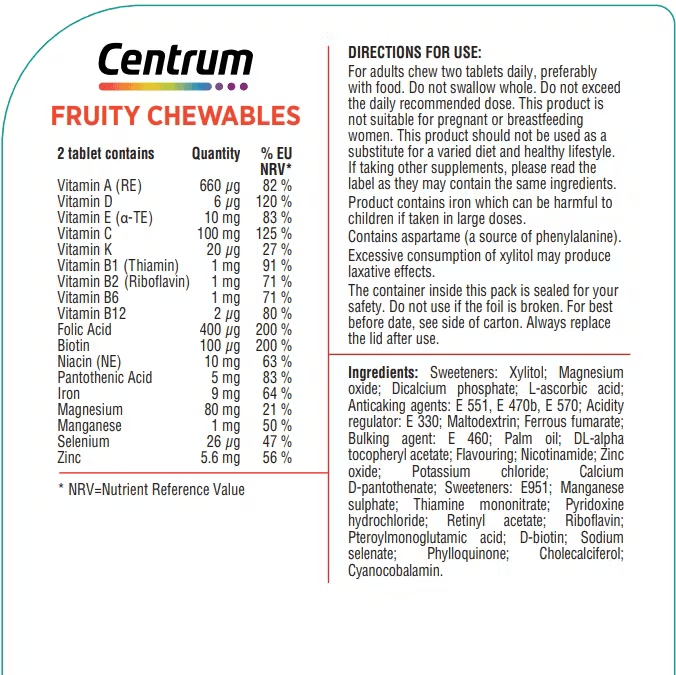 • Centrum Fruity Chewables is not suitable for children under 4 years old.