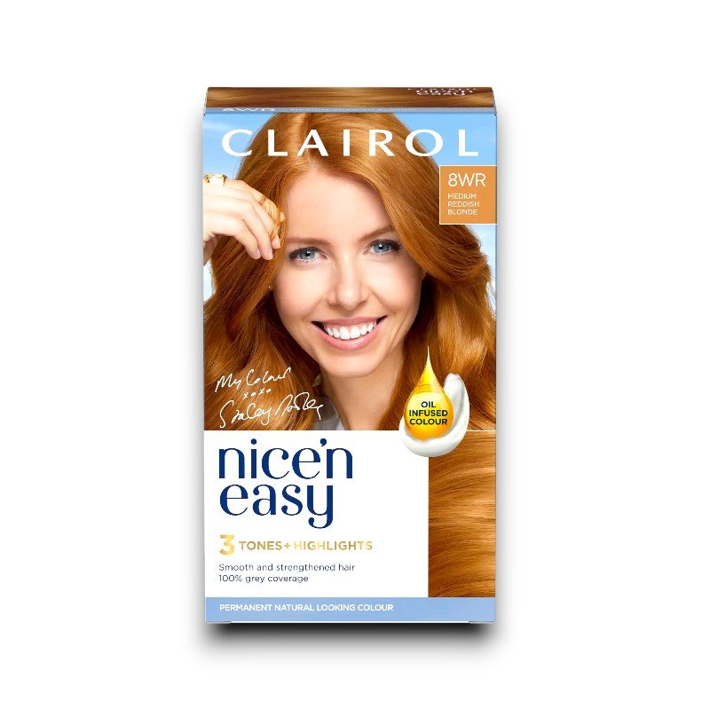 - Clairol Nice’n Easy permanent natural looking colour with 100% gray coverage.