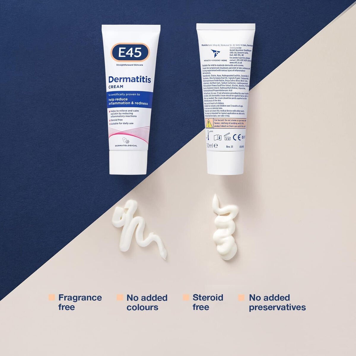 How to Use: Apply E45 Dermatitis Cream twice daily or as needed. Gently massage onto the affected areas of the skin. For optimal results, complement with E45 cleansing products for a complete skincare routine.