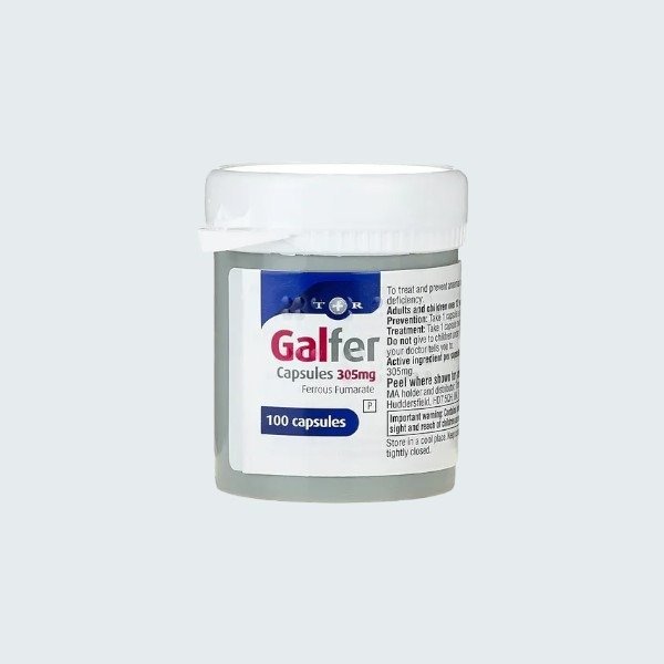 Galfer Ferrous Fumarate 305mg Capsules are an effective iron supplement designed to prevent and treat iron deficiency anaemia. Each capsule contains 305mg of ferrous fumarate (100mg elemental iron), a form of iron that is easily absorbed by the body, helping to restore healthy iron levels and alleviate symptoms of anaemia such as fatigue, weakness, and pallor.