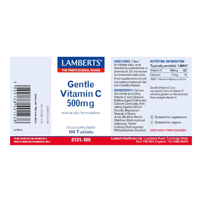 Lamberts Gentle Vitamin C 500mg tablets provide vitamin C in the form of calcium ascorbate which is a gentle non-acidic form of vitamin C that is believed to be gentler on the stomach. Due to its acidity, vitamin C may cause slight gastric upset in those with very sensitive stomachs and so this product is ideal for anyone sensitive to vitamin C or who is taking large daily doses.