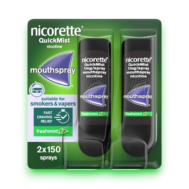 Nicorette QuickMist Mouthspray delivers fast-acting relief from nicotine cravings. This discreet, mint-flavoured spray helps reduce withdrawal symptoms and supports smoking or vaping cessation, anytime, anywhere.