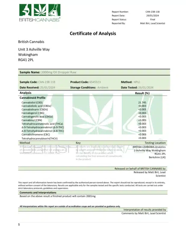 This CBD RAW Cannabis Oil is rich in active cannabinoids and terpenes, the darker colour is evidence of this. Our RAW CBD oil isn’t as purified as our Refined CBD Cannabis Oils, this oil contains every plant constituent you’d find in cannabis straight from the farm.At BRITISH CANNABIS™ we’ve spent time and effort in researching and developing CBD, to bring you the very best CBD oil UK food supplements!At CBD by BRITISH CANNABIS™, we’re passionate about developing top-notch CBD food supplements. Our products meet the exacting standards required by pharmacists for retail sales, making us a trusted choice for those seeking a reliable source of CBD oil in the UK.As one of the longest-standing brands in the industry, we take pride in our commitment to excellence and dedication to getting things right. Experience the difference with CBD by BRITISH CANNABIS™.