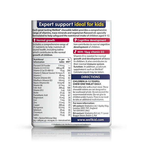 Vitabiotics Wellkid Multi-vitamin Chewable Tablets provide 21 carefully balanced nutrients, including vitamin D, iron, and iodine, to support children’s growth, bone health, and cognitive development. Specially designed for kids aged 4–12, with a delicious natural fruit flavour.