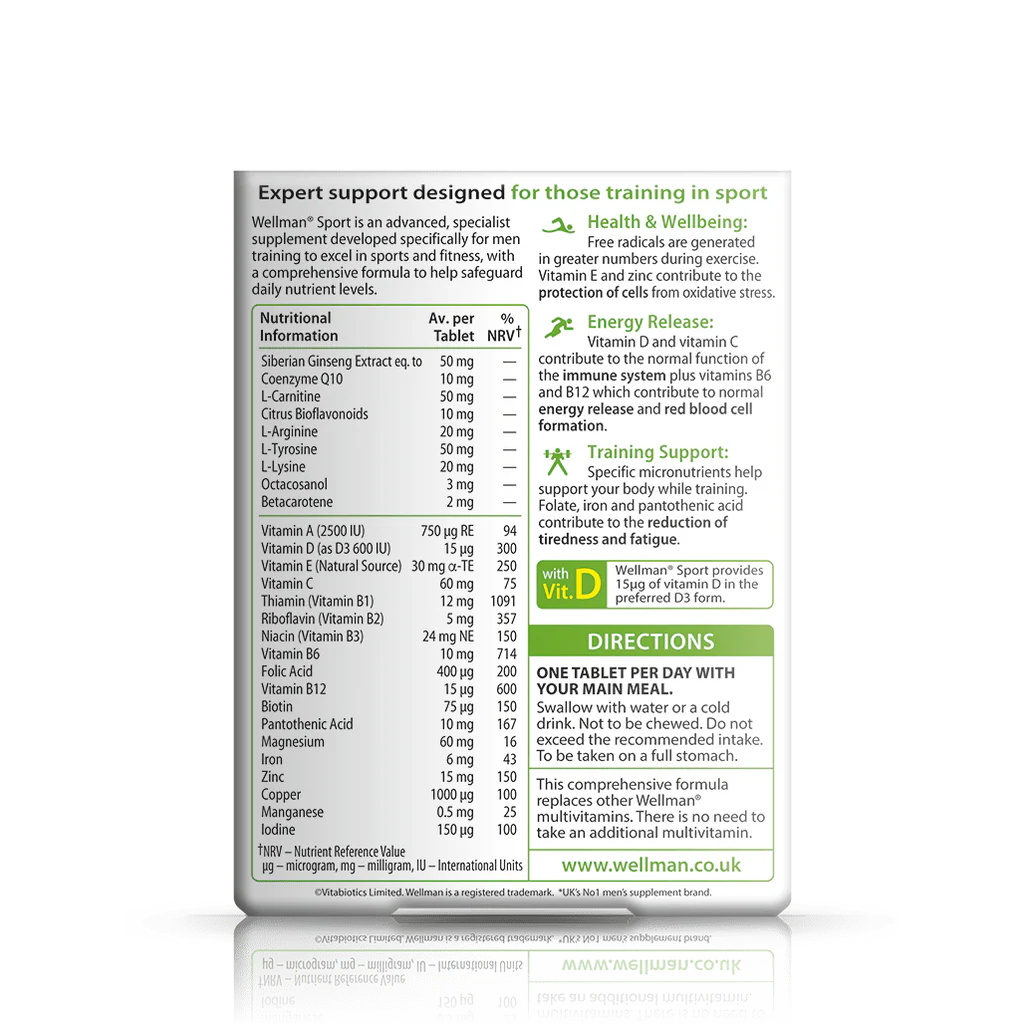 Vitabiotics Wellman Sport Tablets deliver advanced nutritional support with 27 nutrients, including iron, magnesium and CoQ10, designed to reduce fatigue, support energy release, and maintain performance for active men engaged in sports and fitness.