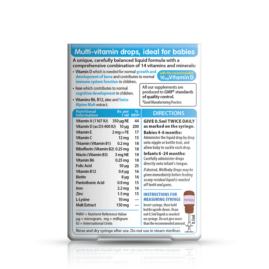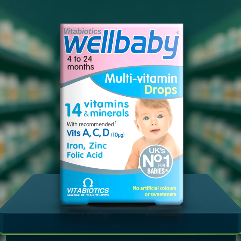 Vitabiotics Wellbaby Multi-vitamin Drops provide 14 carefully balanced nutrients including vitamins A, C and D, plus iron to support normal cognitive development. Suitable for babies aged 4–24 months, these drops help safeguard nutrition and support growth, bone development, and immunity.
